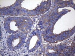 - Immunohistochemical staining of paraffin-embedded Adenocarcinoma of Human colon tissue using anti-CYTH2 mouse monoclonal antibody. (Heat-induced epitope retrieval by 1mM EDTA in 10mM Tris buffer (pH8.5) at 120°C for 3 min, TA809012)(1:150).