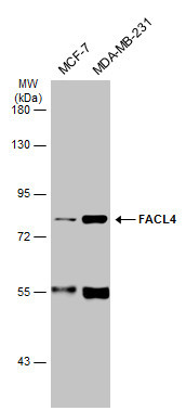 - Various whole cell extracts (30 ?g) were separated by 7.5% SDS-PAGE, and the membrane was blotted with FACL4 antibody [N1N3] (GTX114399) diluted at 1:1000. The HRP-conjugated anti-rabbit IgG antibody (GTX213110-01) was used to detect the primary antibody.