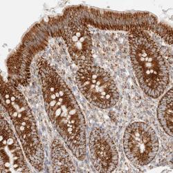 - Immunohistochemical staining of human appendix shows strong granular cytoplasmic positivity in glandular cells.
