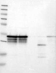 - Western blot analysis of antibody specificity using a routine panel composed of IgG/HSA-depleted human plasma and protein lysates from selected human tissues and cell lines.