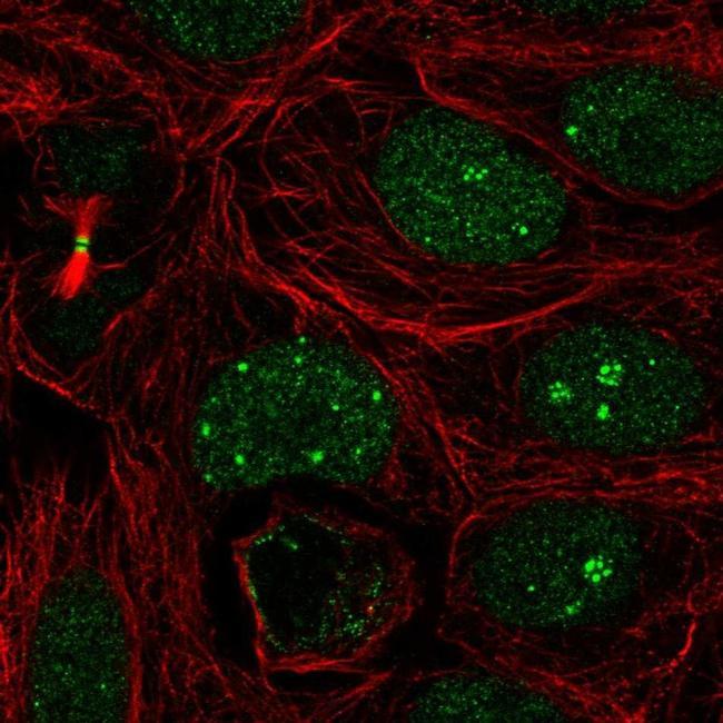 - Immunofluorescent staining of RBM18 in human cell line MCF7 using a RBM18 Polyclonal Antibody (Product # PA5-63425) shows localization to nucleus, nucleoli fibrillar center and midbody.