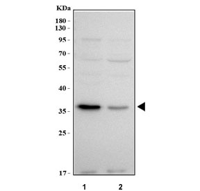 - Western blot testing of human 1) A549 and 2) RT4 cell lysate with PROSER3 antibody. Predicted molecular weight ~51/35/21 kDa (multiple isoforms).