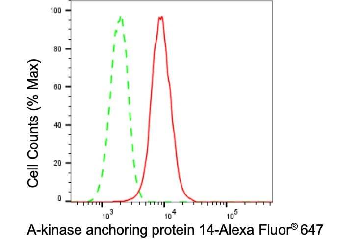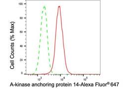 - Flow cytometry analysis of AKAP14 in H9c2 cells using AKAP14 recombinant monoclonal antibody (Product # MA5-52642) at a dilution of 1:2,000. Green, isotype control; red, AKAP14.