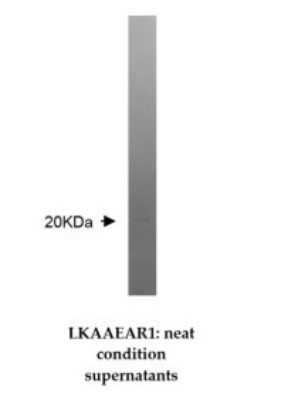 - Western Blot: LKAAEAR Motif Containing Protein 1 Antibody (Z36P2C1E7) [NBP2-50477] - Shows detection of a 20 kDa band in a Jurkat cell lysate.