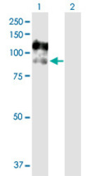 - Western Blot analysis of CSF3R expression in transfected 293T cell line (H00001441-T02) by CSF3R MaxPab polyclonal antibody.Lane 1: CSF3R transfected lysate(92.20 KDa).Lane 2: Non-transfected lysate.