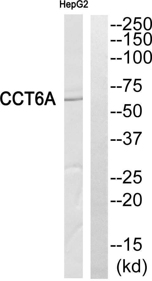 - Western blot analysis of TCP-1 zeta/CCT6A in extracts from HepG2 cells using a TCP-1 zeta/CCT6A polyclonal antibody (Product # PA5-39492).