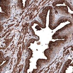 - Immunohistochemical staining of RAB27B in human prostate using RAB27B Polyclonal Antibody (Product # PA5-54096) shows strong apical membrane and cytoplasmic positivity in glandular cells.