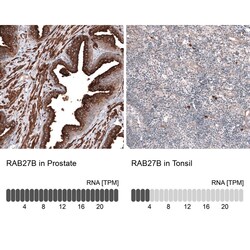 - Immunohistochemical staining of RAB27B in human prostate and tonsil tissues using RAB27B Polyclonal Antibody (Product # PA5-54096). Corresponding RAB27B RNA-seq data are presented for the same tissues.