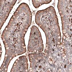 - Immunohistochemical staining of RAB27B in human small intestine using RAB27B Polyclonal Antibody (Product # PA5-54096) shows strong positivity in apical membranes in glandular cells.