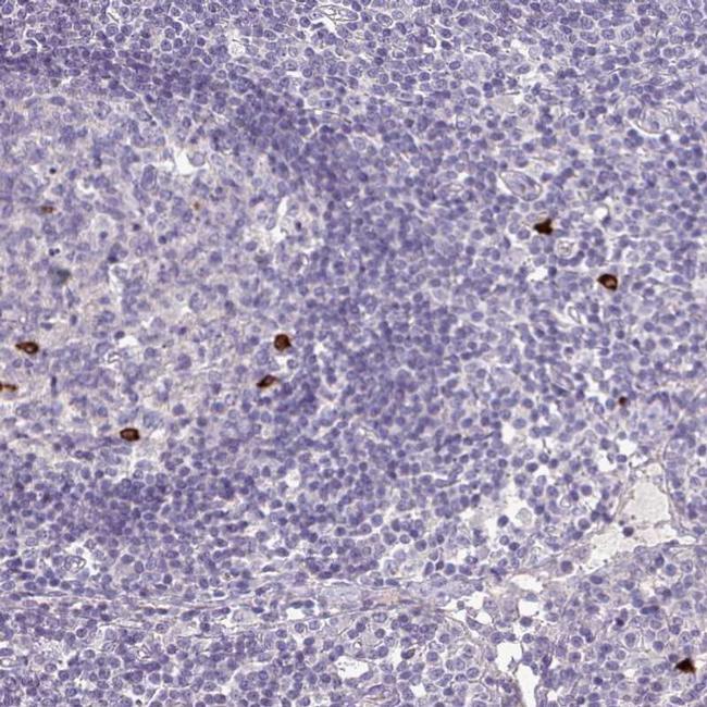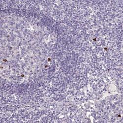 - Immunohistochemical staining of CXorf66 in human lymph node shows strong positivity in a subset of leukocytes. Samples were probed using a CXorf66 Polyclonal Antibody (Product # PA5-61759).