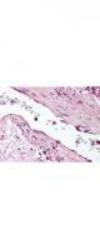 - anti-ANG1 antibody was diluted 1:500 to detect ANG1 in human lung tissue. Tissue was formalin fixed and paraffin embedded. No pre-treatment of sample was required. The image shows the localization of antibody as the precipitated red signal, with a hematoxylin purple nuclear counter stain.