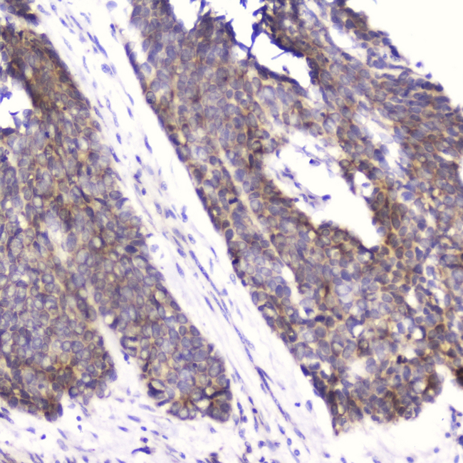 - IHC analysis of Cardiac FABP using anti-Cardiac FABP antibody. Cardiac FABP was detected in paraffin-embedded section of human oesophagus squama cancer tissue. Heat mediated antigen retrieval was performed in citrate buffer (pH6, epitope retrieval solution) for 20 mins. The tissue section was blocked with 10% goat serum. The tissue section was then incubated with 2?g/ml rabbit anti-Cardiac FABP Antibody overnight at 4?C. Biotinylated goat anti-rabbit IgG was used as secondary antibody and incubated for 30 minutes at 37?C. The tissue section was developed using Strepavidin-Biotin-Complex (SABC) with DAB as the chromogen.