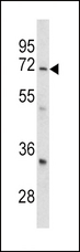 - Western blot of GARP antibody in CEM cell line lysates (35 ug/lane). GARP (arrow) was detected using the purified antibody.