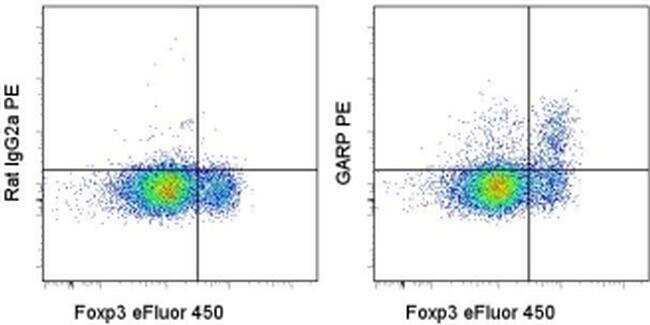 - Normal human peripheral blood cells were stimulated with immobilized Anti-Human CD3 Functional Grade Purified (Product # 16-0037-81), soluble Anti-Human CD28 Functional Grade Purified (Product # 16-0289-81), and Human IL-2 Recombinant Protein (Product # 14-8029-81) for 24 hours. Cells were surface stained with Anti-Human CD4 FITC (Product # 11-0049-42) and Rat IgG2a K Isotype Control PE (Product # 12-4321-80) (left) or Anti-Human GARP PE (right). Cells were then fixed and permeabilized with the Foxp3 Staining Buffer Set (Product # 00-5523-00) followed by intracellular staining with Anti-Human Foxp3 eFluor® 450 (Product # 48-4776-42). CD4+ cells in the lymphocyte gate were used for analysis.