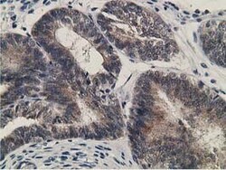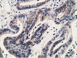 - Immunohistochemical staining of paraffin-embedded Adenocarcinoma of Human colon tissue using anti-KCTD14 mouse monoclonal antibody. (Heat-induced epitope retrieval by 10mM citric buffer, pH6.0, 100°C for 10min, TA502638)
