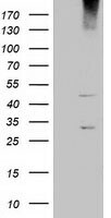 - HEK293T cells were transfected with the pCMV6-ENTRY control (Left lane) or pCMV6-ENTRY KCTD14 (RC200745, Right lane) cDNA for 48 hrs and lysed. Equivalent amounts of cell lysates (5 µg per lane) were separated by SDS-PAGE and immunoblotted with anti-KCTD1. Positive lysates LY411435 (100 µg) and LC411435 (20 µg) can be purchased separately from OriGene.