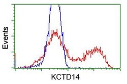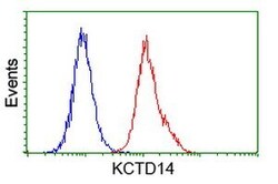 - HEK293T cells transfected with either RC200745 overexpress plasmid (Red) or empty vector control plasmid (Blue) were immunostained by anti-KCTD14 antibody (TA502638), and then analyzed by flow cytometry.