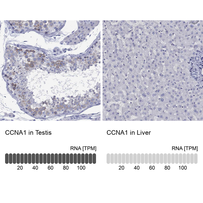 - Immunohistochemistry analysis in human testis and liver tissues using Anti-CCNA1 antibody. Corresponding CCNA1 RNA-seq data are presented for the same tissues.