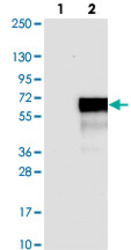 - Western blot analysis of Lane 1: Negative control (vector only transfected HEK293T lysate).Lane 2: Over-expression lysate (Co-expressed with a C-terminal myc-DDK tag (~3.1 kDa) in mammalian HEK293T cells with FAM53C polyclonal antibody (Cat # PAB23984).