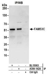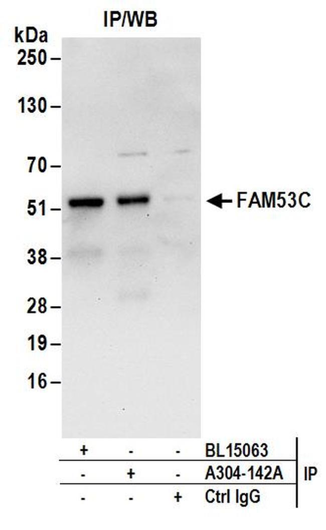 - Detection of human FAM53C by western blot of immunoprecipitates. Samples: Whole cell lysate (1 mg for IP; 20% of IP loaded) from HeLa cells. Antibodies: Affinity purified rabbit anti-FAM53C antibody A304-142A (lot A304-142A-1) used for IP at 6 µg/mg lysate. FAM53C was also immunoprecipitated by rabbit anti-FAM53C antibody BL15063. For blotting immunoprecipitated FAM53C, A304-142A was used at 1 µg/ml. Detection: Chemiluminescence with an exposure time of 30 seconds.