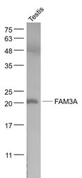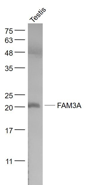 - Mouse testis lysates probed with FAM3A Polyclonal Antibody, Unconjugated (bs-0773R) at 1:1000 dilution and 4°C overnight incubation. Followed by conjugated secondary antibody incubation at 1:20000 for 60 min at 37°C.