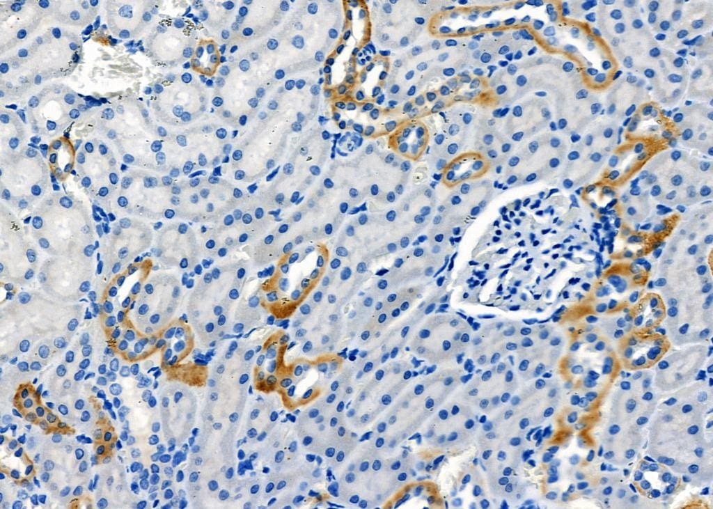 - Immunohistochemistry analysis of RAB35 in mouse kidney tissue. The sample was formaldehyde fixed and a heat mediated antigen retrieval step in citrate buffer was performed. Samples were incubated with RAB35 polyclonal antibody (Product # PA5-103244) using a dilution of 1:100 (4°C overnight) followed by HRP conjugated anti-Rabbit secondary antibody.