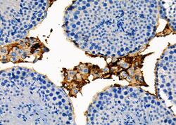 - Immunohistochemistry analysis of RAB35 in mouse testis tissue. The sample was formaldehyde fixed and a heat mediated antigen retrieval step in citrate buffer was performed. Samples were incubated with RAB35 polyclonal antibody (Product # PA5-103244) using a dilution of 1:100 (4°C overnight) followed by HRP conjugated anti-Rabbit secondary antibody.