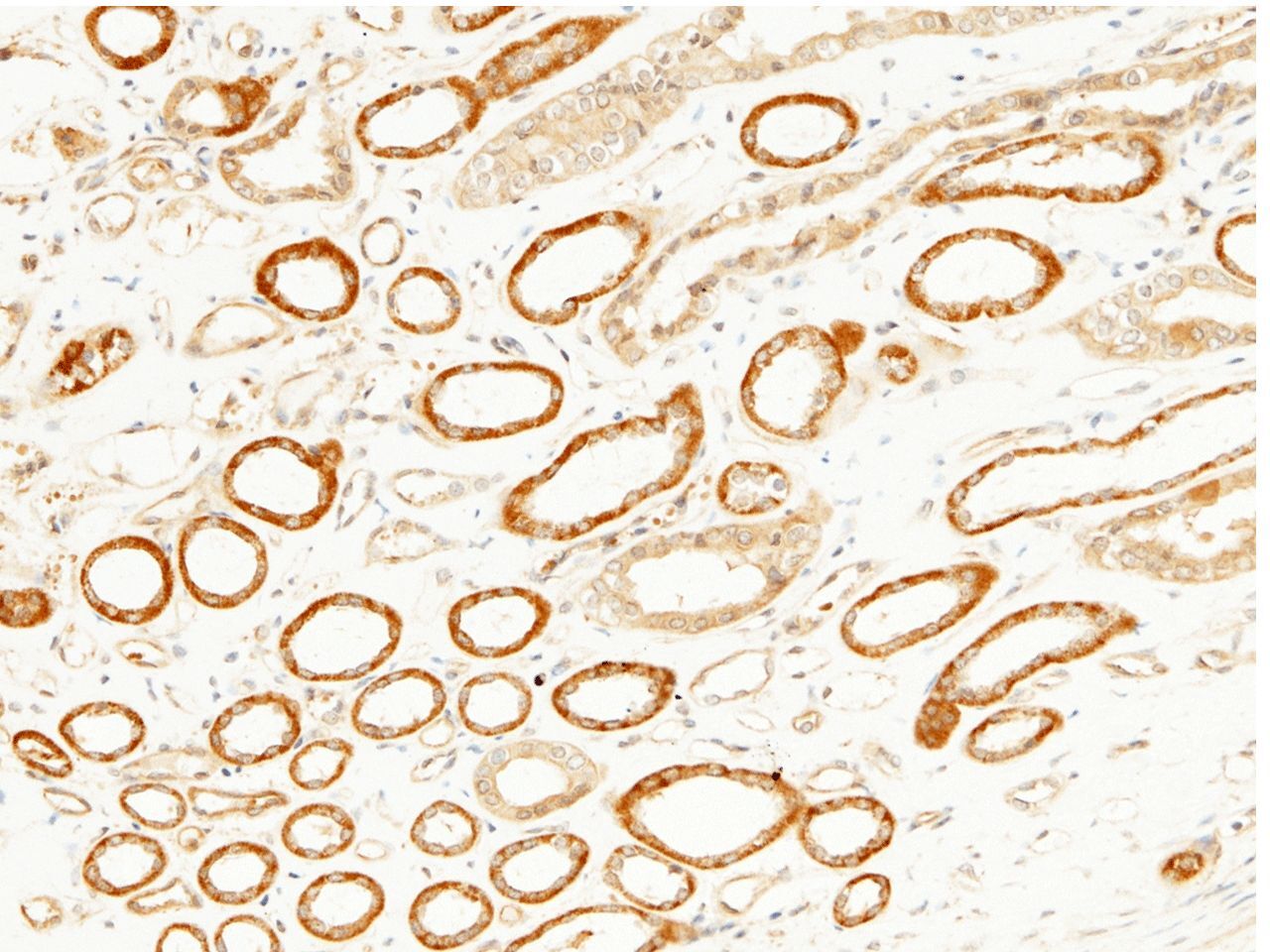 - Immunohistochemical staining of human JNK2 in human kidney with JNK2 Recombinant Rabbit Monoclonal Antibody (11) (Product # MA5-29409, 1:1,000, formalin-fixed paraffin embedded sections).