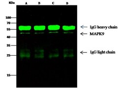 - JNK2 Immunoprecipitation using: Lane A: 0.5 mg HepG2 Whole Cell Lysate, Lane B: 0.5 mg Hela Whole Cell Lysate, Lane C: 0.5 mg Jurkat Whole Cell Lysate, Lane D: 0.5 mg MCF-7 Whole Cell Lysate 0.5 µL with JNK2 Recombinant Rabbit Monoclonal Antibody (11) (Product # MA5-29409) and 15 µL of 50 % Protein G agarose. Primary antibody: JNK2 Recombinant Rabbit Monoclonal Antibody (11), at 1:500 dilution. Secondary antibody: Dylight 800-labeled antibody to rabbit IgG (H+L), at 1:5,000 dilution. Developed using the Odyssey technique. Performed under reducing conditions. Predicted band size: 44 kDa. Observed band size: 44 kDa.