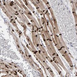 - Immunohistochemical staining of human heart muscle shows strong membranous positivity in myocytes.