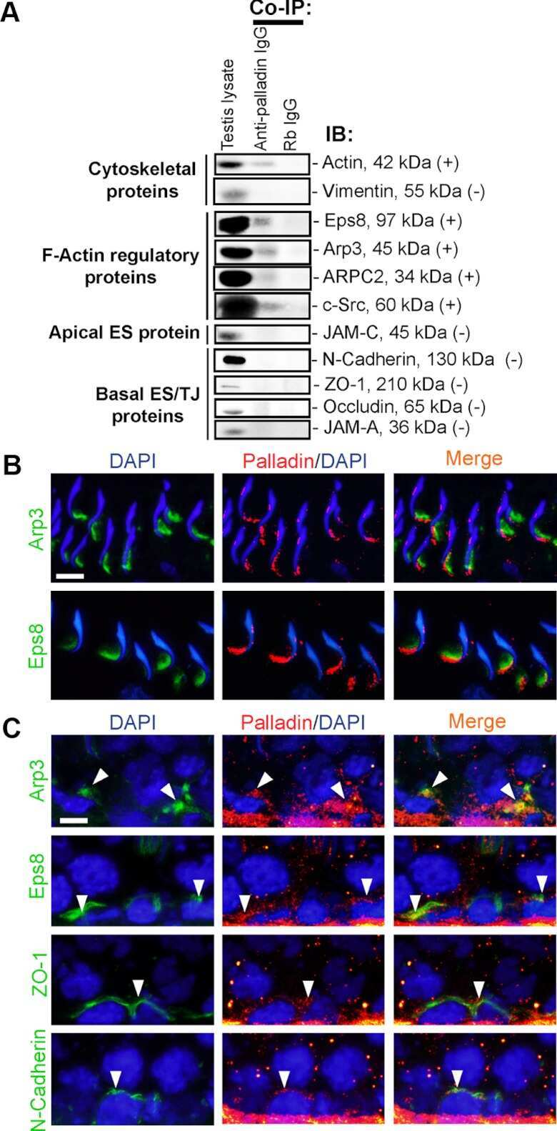 - Figure 3 Rai14 is an apical and basal ES protein in the rat testis. Dual-labeled immunofluorescence analysis was used to assess co-localization of Rai14 (red) with constituent protein laminin-gamma3 chain (green), actin regulatory protein Arp3 (green), actin binding protein drebrin E (green) and actin filament cross-linking protein palladin (green) at the apical ES in stage VII tubules when these proteins were all highly expressed. It was found that Rai14 indeed partially co-localized with each of these apical ES proteins (see ""orange yellow"" in merged images) as shown in ( A ). Rai14 (red) also partially co-localized with basal ES/TJ protein ZO-1 (see ""yellow"" arrowheads), and to a lesser extent with N-cadherin (see ""white"" arrowheads) in stage IV-V tubules when these proteins were highly expressed as shown in ( B ). Bar = 10 um in ( A ) or ( B ), which applies all other images in ( A ) and ( B ).