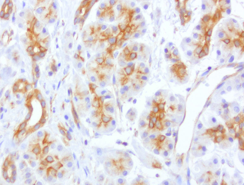- Immunohistochemical staining of paraffin-embedded of human pancreas using anti-CDH2 clone UMAB23 mouse monoclonal antibody at 1:400 dilution of 1.0mg/mL using Polink2 Broad HRP DAB detection kit. UM500023 requires heat-induced epitope retrieval with Citrate pH6.0 in a pressure chamber/cooker high 3min. The image shows gladular cells of the pancreas membraneous and cytoplasmic staining cells.