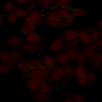 - Immunofluorescent staining of human HeLa cells with CDH2 antibody (clone 8C11, green) and Reddot nuclear stain (red).