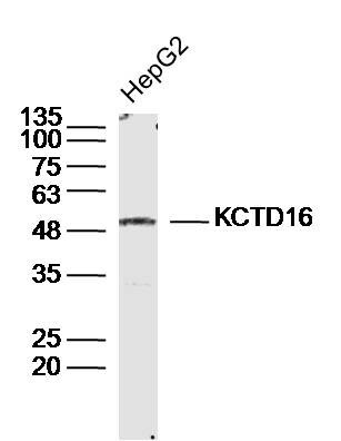 - HepG2 cell lysates probed with KCTD16 Polyclonal Antibody, Unconjugated (bs-20315R) at 1:300 dilution and 4°C overnight incubation. Followed by conjugated secondary antibody incubation at 1:20000 for 60 min at 37°C.