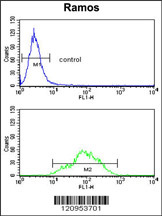 - ETFDH Antibody (N-term) flow cytometry analysis of Ramos cells (bottom histogram) compared to a negative control cell (top histogram).FITC-conjugated goat-anti-rabbit secondary antibodies were used for the analysis.