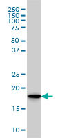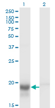 - Western Blot analysis of SKP1 expression in transfected 293T cell line by SKP1A monoclonal antibody (M01), clone 1H8.Lane 1: SKP1 transfected lysate(18.1 KDa).Lane 2: Non-transfected lysate.