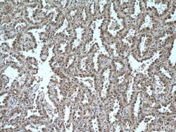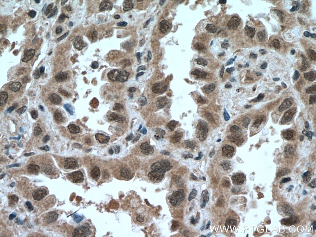 - Immunohistochemistry of paraffin-embedded human lung cancer tissue slide using 10990-2-AP (SKP1 antibody) at dilution of 1:200 (under 10x lens) heat mediated antigen retrieved with Tris-EDTA buffer (pH 9).