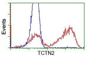- HEK293T cells transfected with either RC203860 overexpress plasmid(Red) or empty vector control plasmid(Blue) were immunostained by anti-TCTN2 antibody(GTX83514), and then analyzed by flow cytometry.