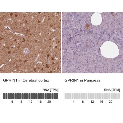 - Immunohistochemistry-Paraffin: GPRIN1 Antibody [NBP2-57958] - Staining in human cerebral cortex and pancreas tissues using anti-GPRIN1 antibody. Corresponding GPRIN1 RNA-seq data are presented for the same tissues.