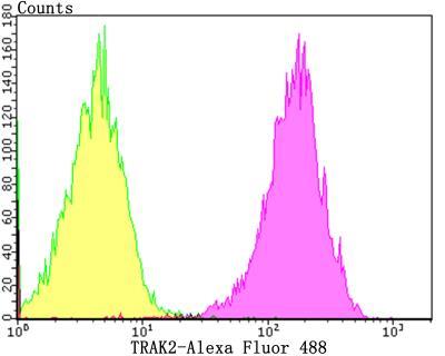 - Flow Cytometry: IRAK2 Antibody (JG36-23) [NBP2-76843] - Flow cytometric analysis of Jurkat cells with IRAK2 antibody at 1/50 dilution (purple) compared with an unlabelled control (cells without incubation with primary antibody; yellow). Alexa Fluor 488-conjugated goat anti-rabbit IgG was used as the secondary antibody.