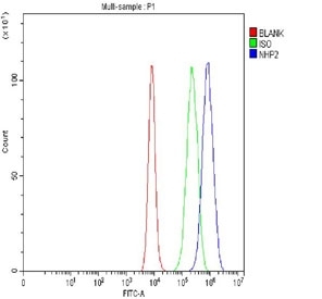 - Flow cytometry testing of fixed and permeabilized human Caco-2 cells with NHP2 antibody at 1ug/million cells (blocked with goat sera); Red=cells alone, Green=isotype control, Blue= NHP2 antibody.