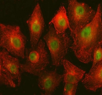 - Immunofluorescent staining of FFPE human A549 cells with NHP2 antibody (green) and Beta Tubulin mAb (red). HIER: steam section in pH6 citrate buffer for 20 min.