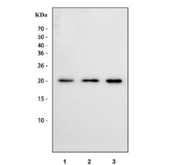 - Western blot testing of human 1) SH-SY5Y, 2) Caco-2 and 3) HeLa cell lysate with NHP2 antibody. Predicted molecular weight ~17 kDa, commonly observed at 17-20 kDa.