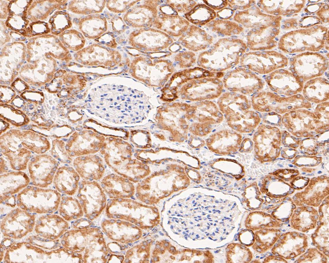 - Immunohistochemical analysis of ZACN in paraffin-embedded human kidney tissue using a polyclonal antibody (Product #PA5-114309). The section was pre-treated using heat mediated antigen retrieval with Tris-EDTA buffer (pH 8.0-8.4) for 20 minutes. The tissues were blocked in 5% BSA for 30 minutes at room temperature, washed with ddH2O and PBS, and then probed with the primary antibody (1:200) for 30 minutes at room temperature. The detection was performed using an HRP conjugated compact polymer system. DAB was used as the chromogen. Tissues were counterstained with hematoxylin and mounted with DPX.