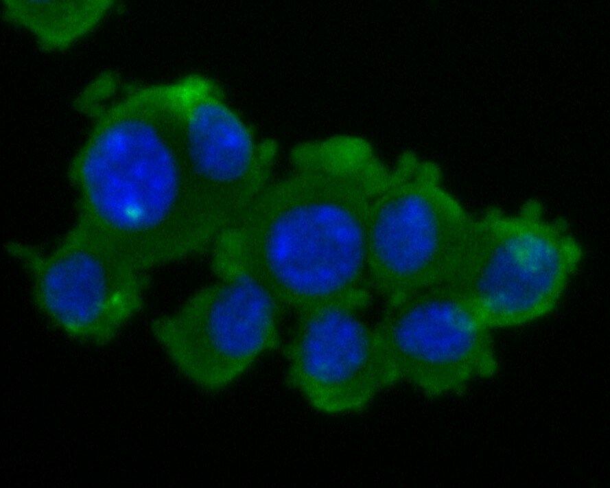 - Immunocytochemical analysis of ZACN in SiHa cells using a ZACN polyclonal antibody (Product #PA5-114309). Formalin fixed cells were permeabilized with 0.1% Triton X-100 in TBS for 10 minutes at room temperature and blocked with 1% Blocker BSA for 15 minutes at room temperature. Cells were probed with the primary antibody for 1 hour at room temperature, washed with PBS. Alexa Fluor®488 Goat anti-Rabbit IgG was used as the secondary antibody at 1:1,000 dilution. The nuclear counter stain is DAPI.