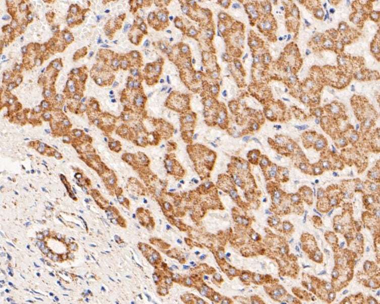 - Immunohistochemical analysis of ZACN in paraffin-embedded human liver tissue using a polyclonal antibody (Product #PA5-114309). The section was pre-treated using heat mediated antigen retrieval with Tris-EDTA buffer (pH 8.0-8.4) for 20 minutes. The tissues were blocked in 5% BSA for 30 minutes at room temperature, washed with ddH2O and PBS, and then probed with the primary antibody (1:200) for 30 minutes at room temperature. The detection was performed using an HRP conjugated compact polymer system. DAB was used as the chromogen. Tissues were counterstained with hematoxylin and mounted with DPX.