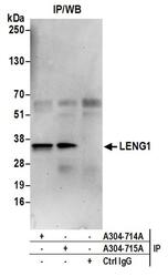 - Detection of human LENG1 by western blot of immunoprecipitates. Samples: Whole cell lysate (0.5 or 1.0 mg per IP reaction; 20% of IP loaded) from 293T cells prepared using NETN lysis buffer. Antibodies: Affinity purified rabbit anti-LENG1 antibody A304-714A (lot A304-714A-1) used for IP at 6 µg per reaction. LENG1 was also immunoprecipitated by rabbit anti-LENG1 antibody A304-715A. For blotting immunoprecipitated LENG1, A304-714A was used at 0.4 µg/ml. Detection: Chemiluminescence with an exposure time of 30 seconds.