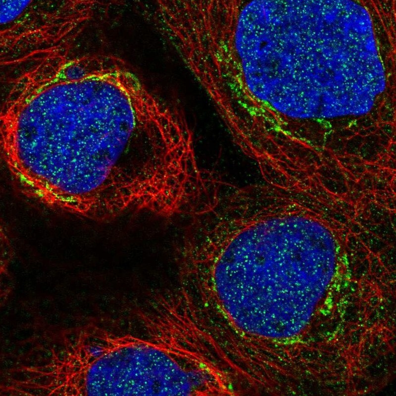 - Immunofluorescent staining of human cell line A-431 shows localization to nucleus & the Golgi apparatus.