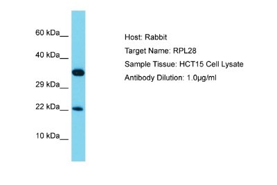 - Western Blot: RPL28 Antibody [NBP2-83467] - Host: Rabbit. Target Name: RPL28. Sample Type: HCT15 Whole Cell lysates. Antibody Dilution: 1.0ug/mlRPL28 is strongly supported by BioGPS gene expression data to be expressed in Human HCT15 cells