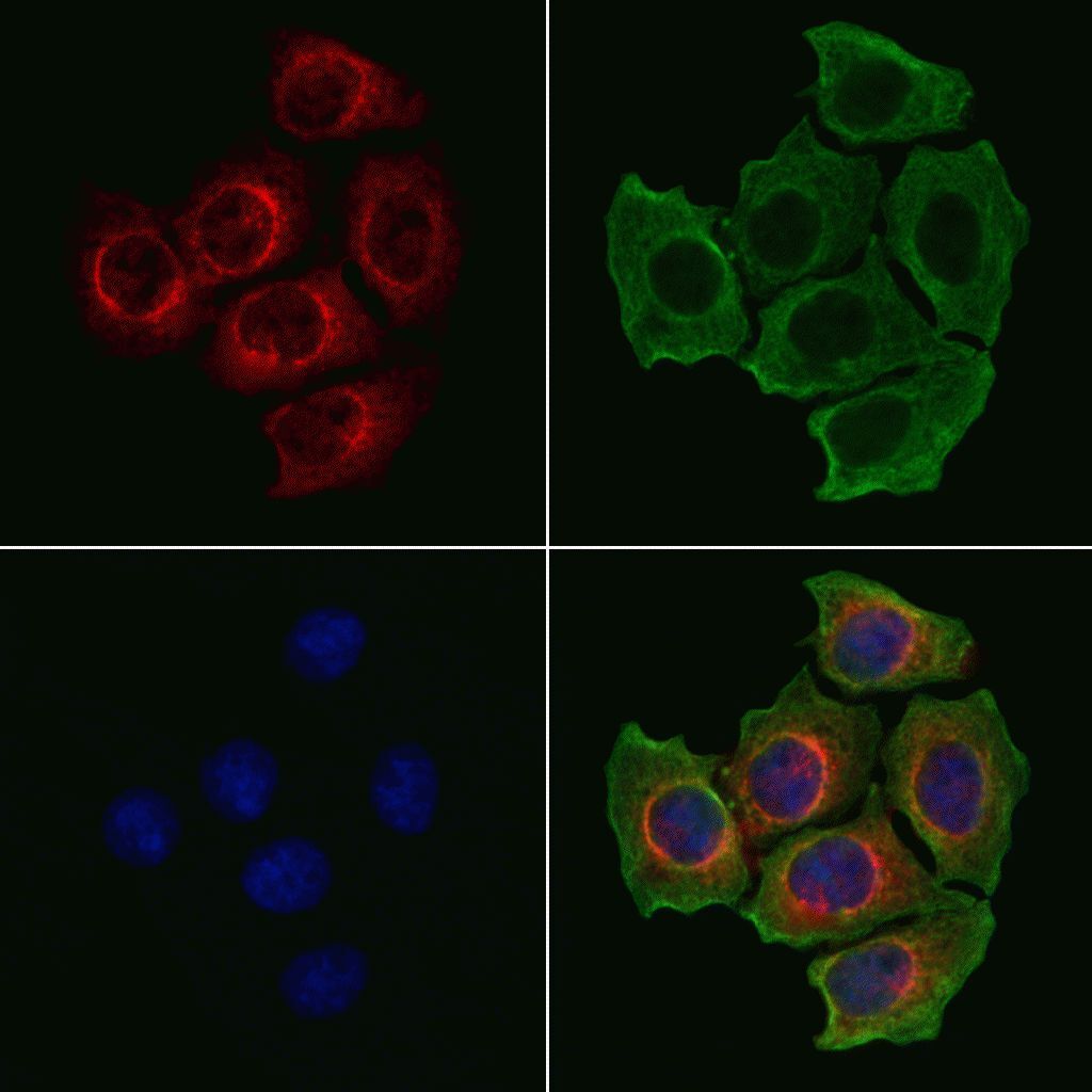 - Immunofluorescent analysis of GCP2 in HepG2 cells. Samples were fixed with paraformaldehyde, permeabilized with 0.1% Triton X-100, blocked with 10% serum (45 min at 25°C), incubated with mouse anti-beta tubulin and GCP2 polyclonal antibody (Product # PA5-103851) using a dilution of 1:200 (1 hr, 37°C), and followed by goat anti-rabbit IgG Alexa Fluor 594 (red) and goat anti-mouse IgG Alexa Fluor 488 (green).